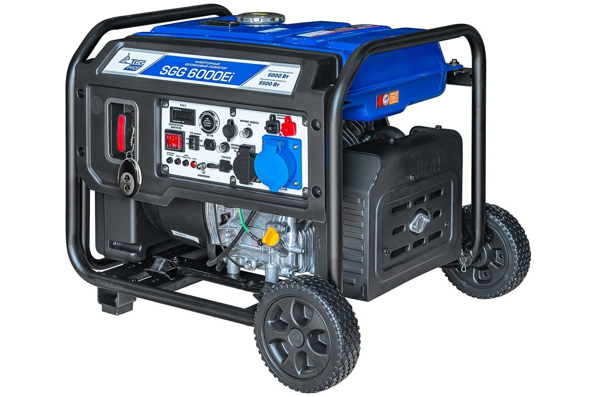 Бензогенератор инверторный SGG 6000Ei с электростартом, коннектором для подключения блока АВР(блок автоматического запуска генератора), укомплектован колесным комплектом для удобства перемещения. Бензиновый генератор предназначен для подключения к нему потребителей тока общей максимальной мощностью до 6,5 кВт. Позволяет напрямую подключать к генератору как обычных потребителей, так и точное электронное оборудование, например, ноутбуки, LCD-телевизоры или смартфон.