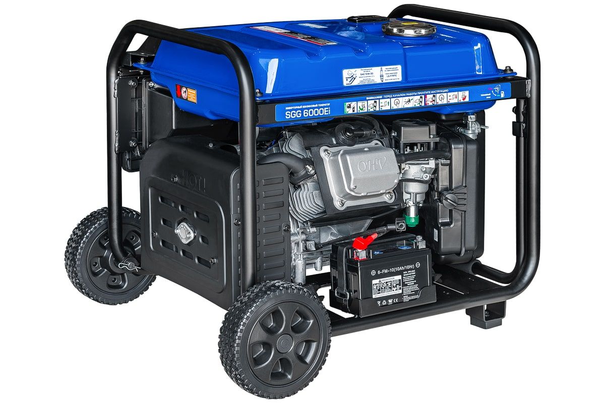 Бензогенератор инверторный SGG 6000Ei  с электростартом, коннекотором для подключения АВР, укомплектован колесным комплетом для удобства перемещения.
